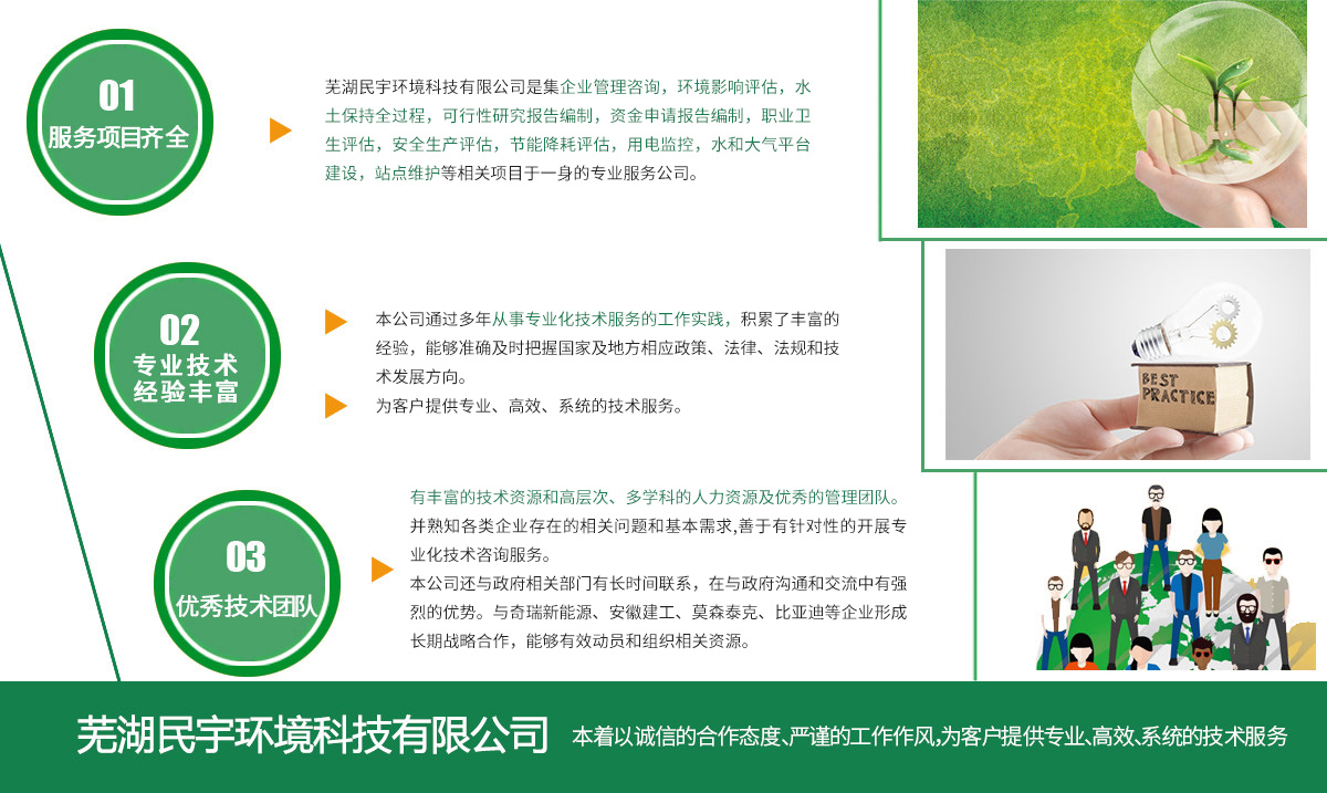 蕪湖民宇環(huán)境科技有限公司是一家致力于為新建企業(yè)和機(jī)構(gòu)出具可行性研究報(bào)告、環(huán)境影響評(píng)估、職業(yè)衛(wèi)生評(píng)估、安全生產(chǎn)評(píng)估、節(jié)能評(píng)估等項(xiàng)目的專業(yè)服務(wù)公司。公司本著以誠(chéng)信的合作態(tài)度、嚴(yán)謹(jǐn)?shù)墓ぷ髯黠L(fēng),為客戶提供專業(yè)、系統(tǒng)的技術(shù)服務(wù)。本公司通過(guò)多年從事專業(yè)化技術(shù)服務(wù)的工作實(shí)踐,積累了豐富的經(jīng)驗(yàn),能夠準(zhǔn)確及時(shí)把握國(guó)家及地方相應(yīng)政策、法律、法規(guī)和技術(shù)發(fā)展方向。有豐富的技術(shù)資源和高層次、多學(xué)科的人力資源及的管理團(tuán)隊(duì)。 并熟知各類企業(yè)存在的相關(guān)問(wèn)題和基本需求,善于有針對(duì)性的開(kāi)展專業(yè)化技術(shù)咨詢服務(wù)。同時(shí),本公司還與其它專業(yè)機(jī)構(gòu)和科研院校建立起長(zhǎng)期合作伙伴關(guān)系,能夠有效動(dòng)員和組織相關(guān)資源,探索并形成了有效的服務(wù)模式,具備了為各類企業(yè)提供更加專業(yè)服務(wù)的能力。 更多>